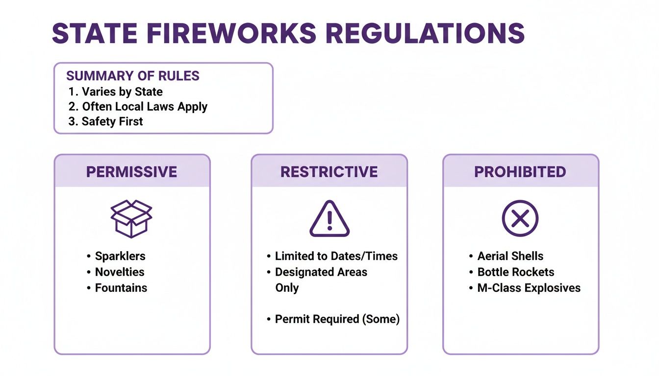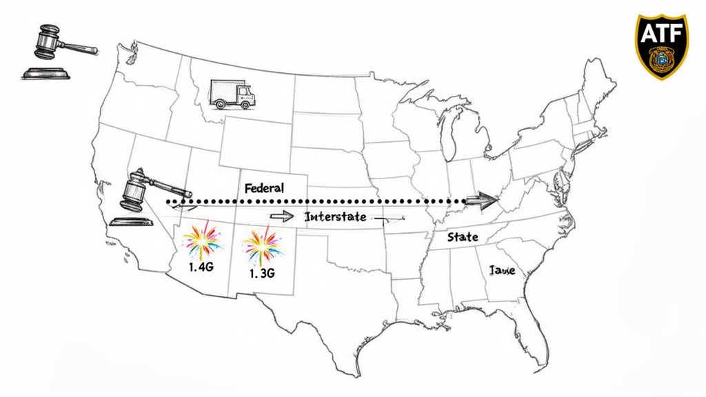 Selling fireworks online means you're stepping into a complicated legal world. Federal law is one thing, but what really matters is the patchwork of individual state laws that say where consumer fireworks can actually be delivered. It creates a tricky situation where shipping from your state might be perfectly legal, but shipping to a customer's state is not. For any online seller, getting this right isn't just good practice—it's critical for staying in business.