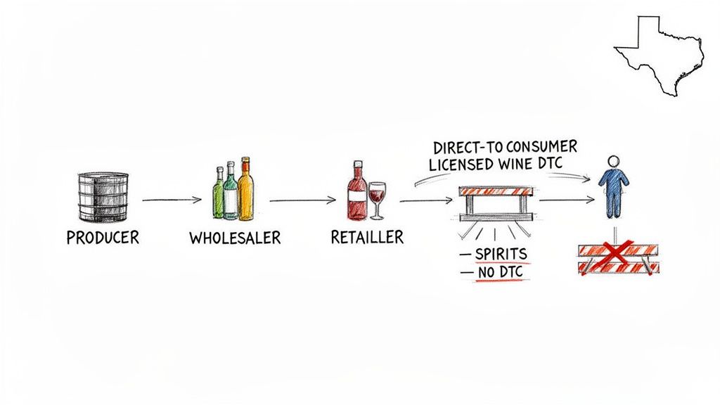 Navigating Texas wine and spirits shipping laws comes down to one critical divide: you can ship wine directly to a customer's doorstep with the right permits, but shipping spirits the same way is strictly forbidden. This single difference shapes the entire eCommerce landscape for anyone selling alcohol in the Lone Star State.